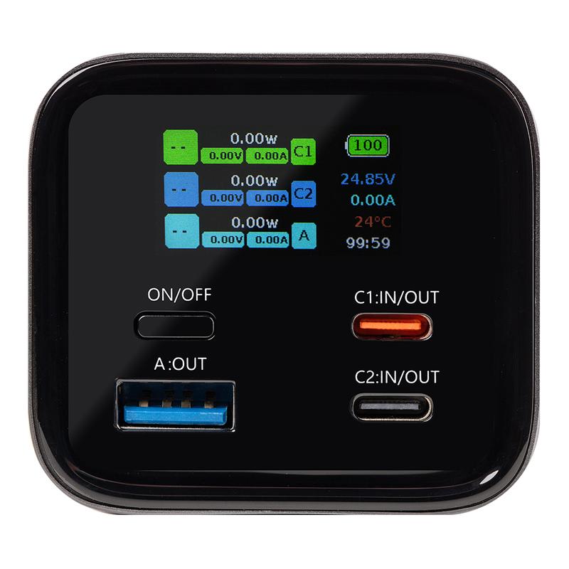 Med 2 USB-C-porter og 1 USB-A-port tilbyr den fleksibel lading av flere enheter i et robust hus av aluminiumslegering. Den integrerte TFT-skjermen viser batterinivå, ladestatus og gjeldende inngangs- eller utgangseffekt, slik at du alltid har en klar oversikt. Det slitesterke, taktisk inspirerte designet og den store strømreserven gjør den til et praktisk valg for brukere som trenger pålitelig lading uten tilgang til stikkontakt.