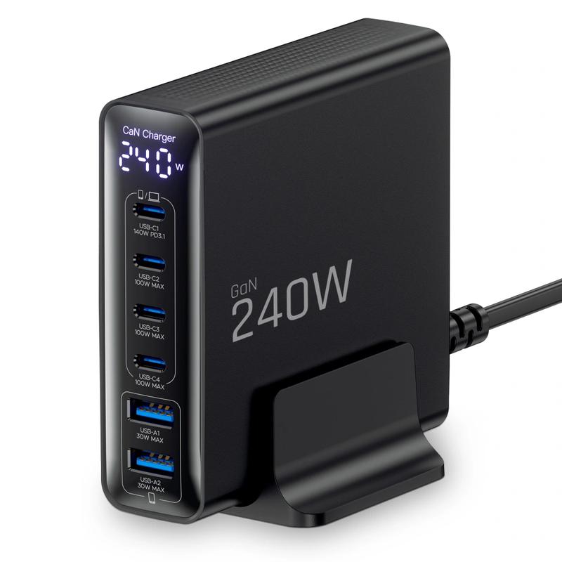 Tech-Protect DC240W-GaN 6-ports skrivebordslader - PD 240 W hurtiglader med 4 USB-C-porter, 2 USB-A-porter og LED-display