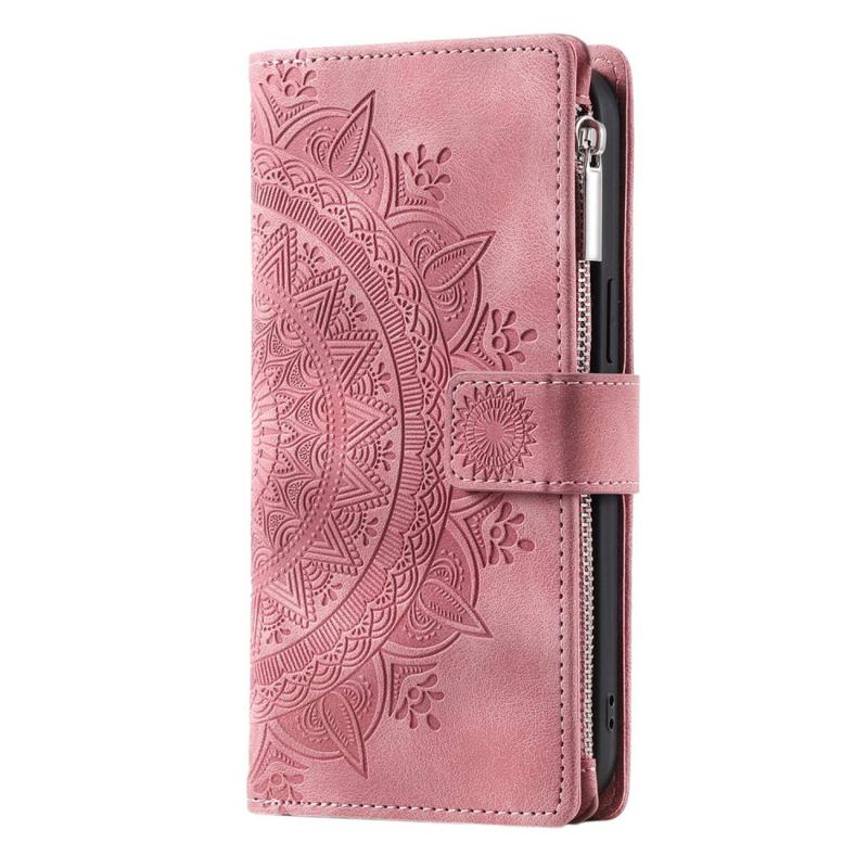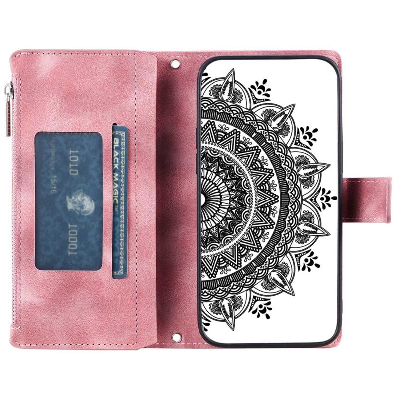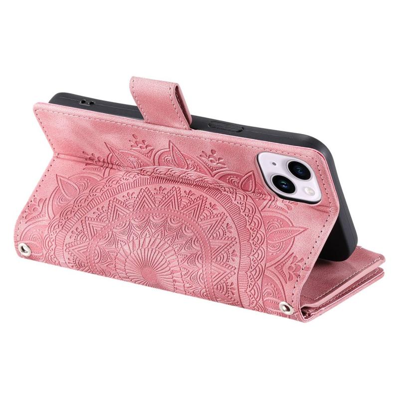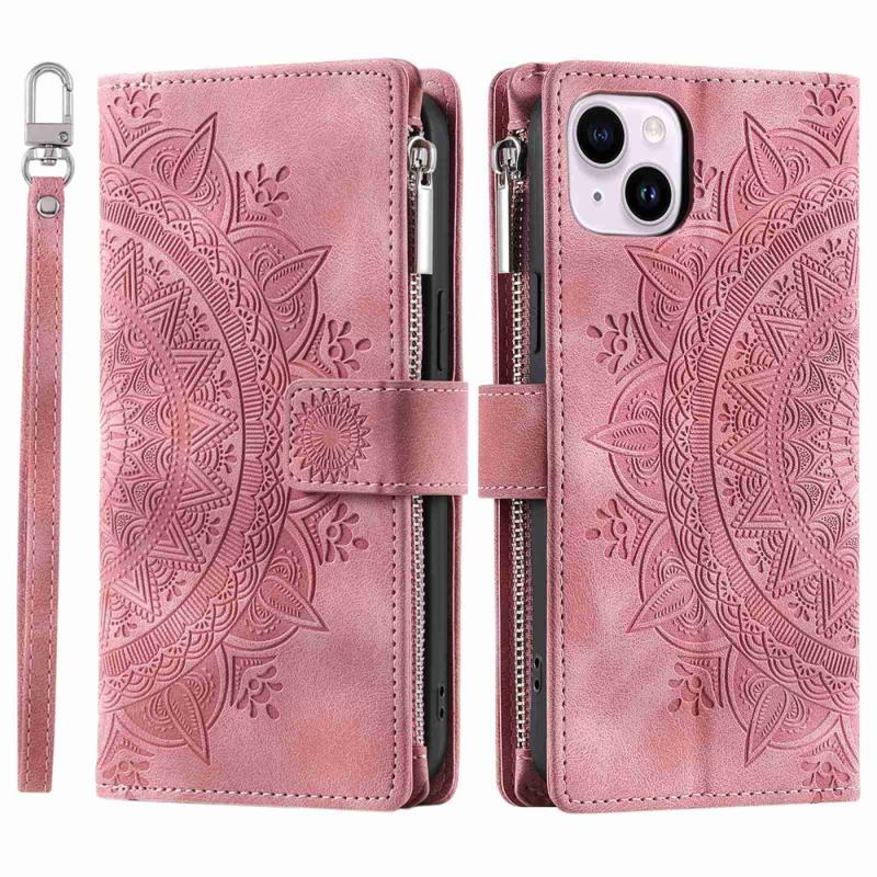 Telefondeksel for iPhone 14 Plus, Anti-ripe Mandala Flower Imprinted PU-skinndekselstativ med flere kortspor Glidelåslomme lommebokveske