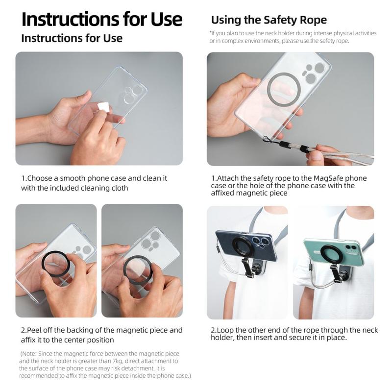 3. Bruk av sikkerhetstau krever et telefonhylster; den ene enden av sikkerhetstauet festes til hullet i telefonhylsteret; plasser den andre enden på hengehalsen, lås hengehalsen og trekk justeringsspennen på sikkerhetstauet til et minimum.
