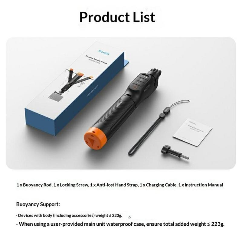 Den innebygde Bluetooth-fjernkontrollen gir ekstra bekvemmelighet ved å tillate trådløs kamerakontroll, og den integrerte stativfunksjonen gjør det enklere å sette staven ned for mer stabil håndfri fotografering. Med et kompakt, sammenleggbart design, lavt strømforbruk og opptil 10 timers brukstid er Telesin S1-TSS-07 et praktisk valg for skapere som ønsker et allsidig grep til actionkameraet for både våte og tørre omgivelser.
