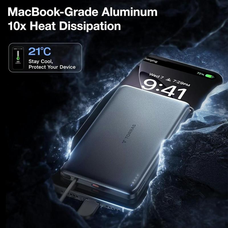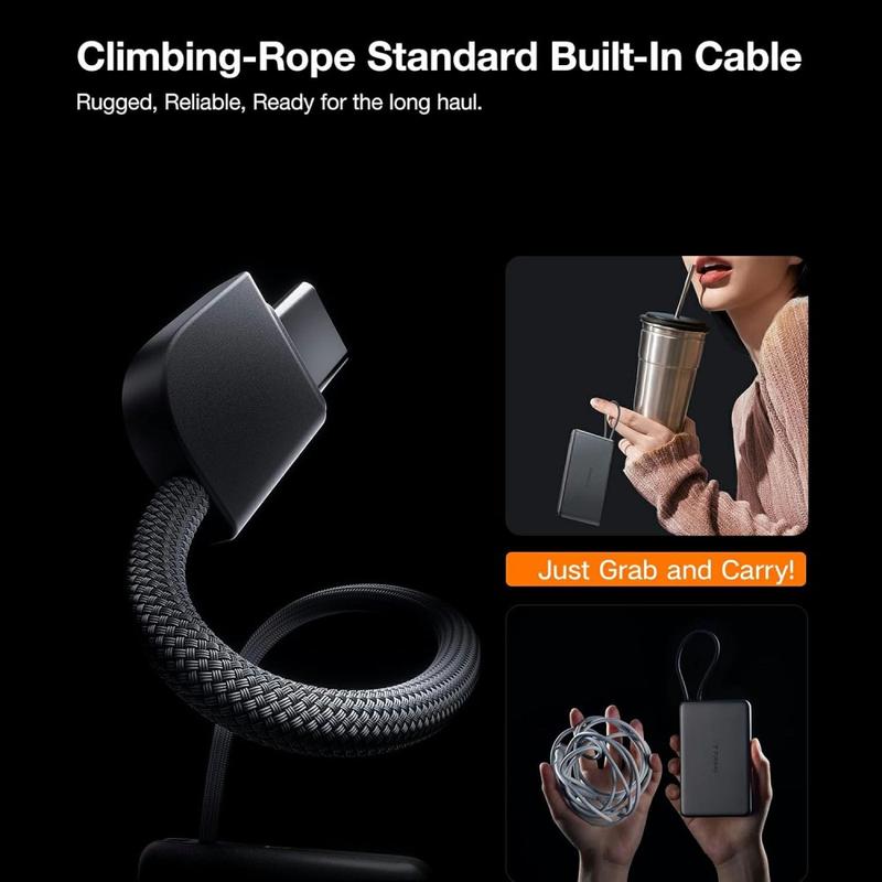 Torras Mini Slim PD Powerbank med innebygd USB-C-kabel - 22,5 W hurtiglading, 10000mAh
