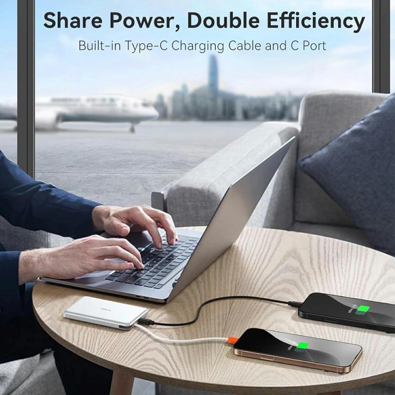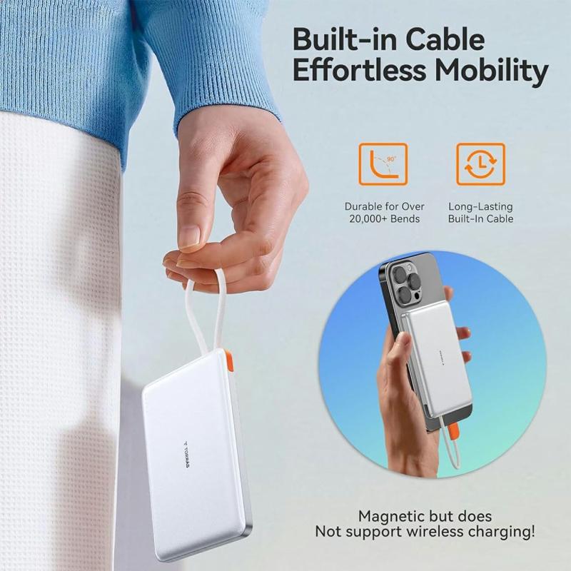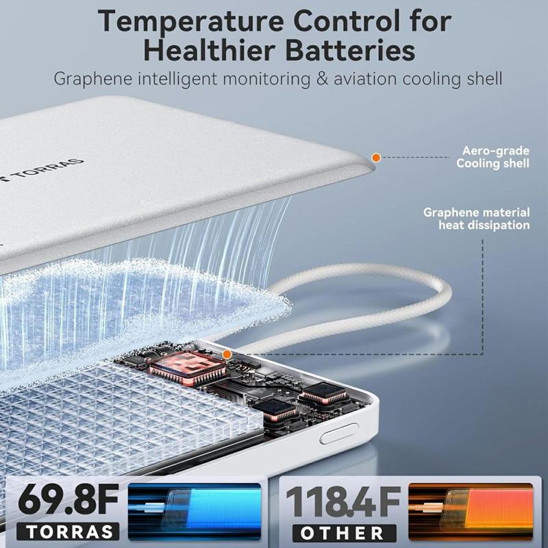Torras Mini Slim PD Powebank med innebygd USB-C-kabel - 22,5 W hurtiglading, 10000mAh