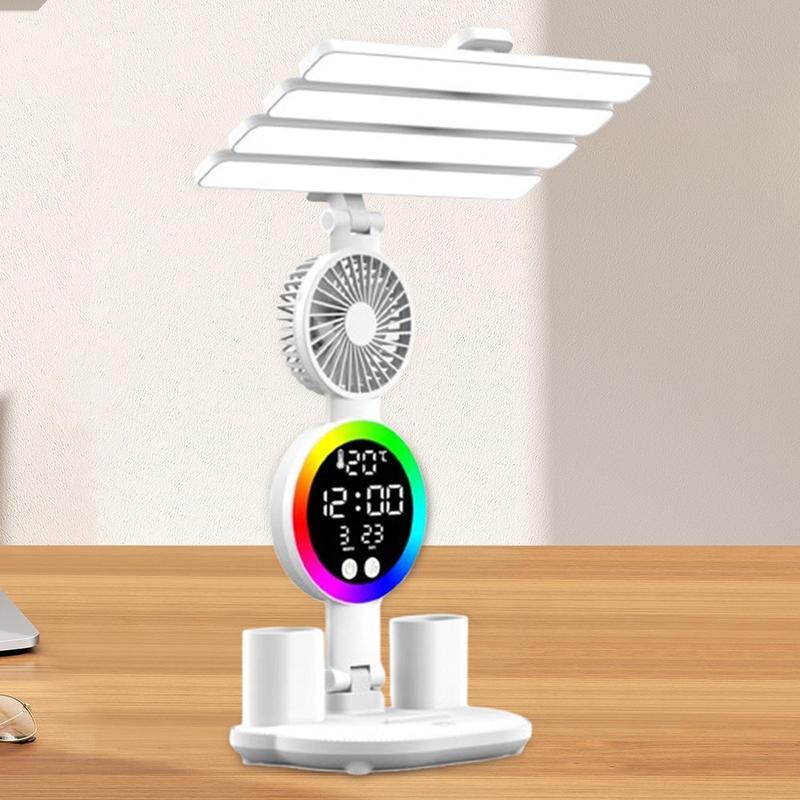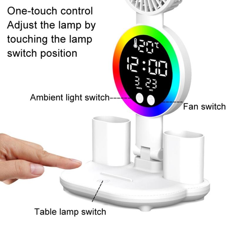 Touch 3 Modes LED Eye Protection Desk Lamp med klokke, vifte og pennholder er den perfekte blandingen av funksjonalitet og stil, noe som gjør den til et uunnværlig tilbehør for ethvert hjem, kontor eller studieplass.