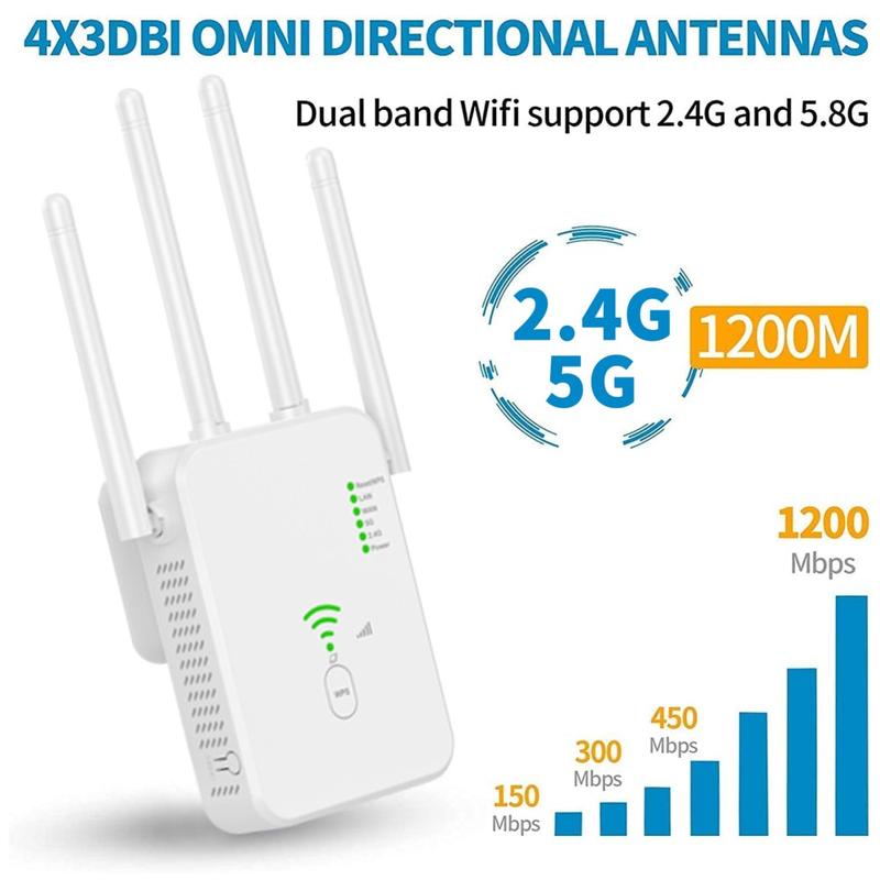 UNT-10 Dual-Band WiFi Booster / Router - 1200 Mbps trådløs signalforlenger med 4 antenner - EU-plugg