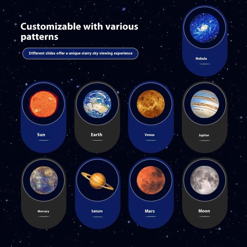 Forvandle ethvert rom til en magisk galakse med Planet Projection Lamp, en 360° roterende LED-nattlampe som er designet for å inspirere til fantasi og avslapning. Lampen er utstyrt med 10 utskiftbare planetbilder som projiserer levende, høyoppløselige bilder av himmelske underverker over vegger og tak, og skaper en beroligende kosmisk atmosfære. Den USB-drevne plug-and-play-designen sikrer bekvemmelighet og energieffektivitet, mens vidvinkellinsen gir et sterkt, men mykt lys som er skånsomt for øynene. Denne lampen er perfekt for barnerom, soverom og boliginnredning, og gir et fortryllende himmelsk preg til leggetid eller avslapping.