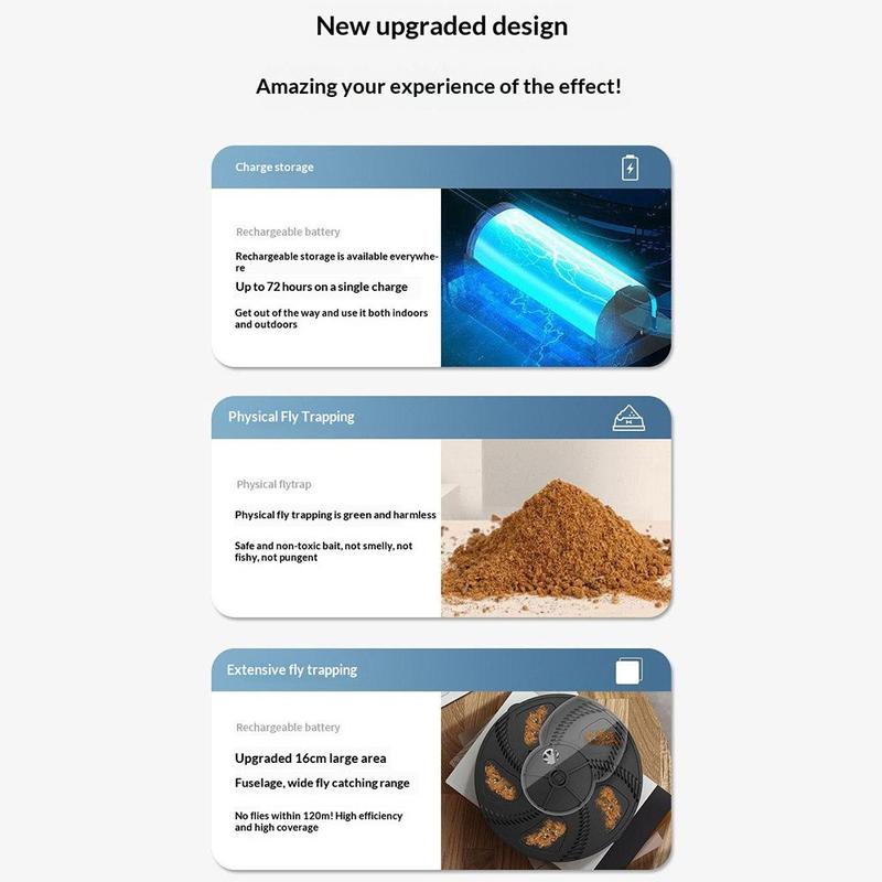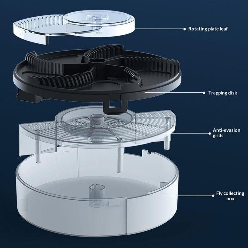 Den automatiske rotasjonsmekanismen har lav driftsstøy, noe som gjør den egnet for bruk både om dagen og om natten uten å forårsake forstyrrelser. Den brede fangstflaten på 16 cm og dekningsområdet på opptil 120 m gjør den effektiv for større innendørsarealer, mens designet som hindrer rømming bidrar til å holde fangede insekter på plass. Den avtakbare strukturen gjør også vedlikeholdet enklere og muliggjør regelmessig rengjøring for mer hygienisk bruk over lang tid.