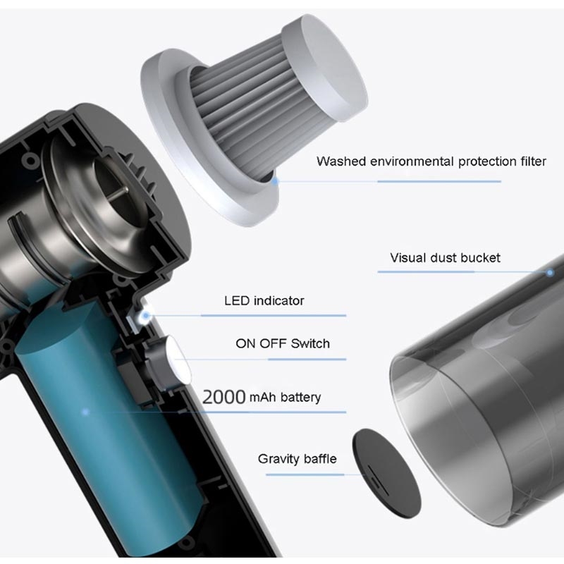 Den batteridrevne bilstøvsugeren på 6000Pa er et kraftig, bærbart rengjøringsverktøy som er designet for å holde bilen, hjemmet og kontoret plettfritt. Med 120 W høytytende sugekraft og et vakuumtrykk på 6000 Pa fjerner den effektivt støv, smuler, dyrehår, sot og til og med små vannflekker. De medfølgende multifunksjonelle børstehodene når inn i trange åpninger, bilseter, gulvmatter og bagasjerom for en grundig rengjøring. Den er lett og batteridrevet, og med et oppladbart batteri på 2000 mAh gir den opptil 30 minutters kontinuerlig bruk på en full lading. Den store støvkoppen på 0,5 liter gjør at du slipper å tømme den så ofte, og USB-lading gir praktisk strømtilførsel fra adaptere, powerbanks eller billadere.