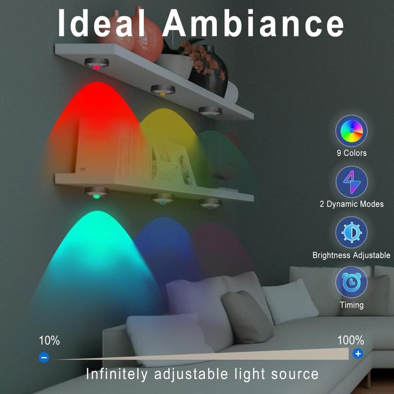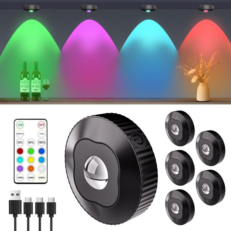 De 6 RGB-skaplampene er en sømløs blanding av funksjonalitet og estetikk. Den USB-oppladbare designen og den fjernstyrte betjeningen gjør dem brukervennlige og energieffektive, mens de tilpassbare RGB-belysningsalternativene imøtekommer ulike stemninger og behov. Disse lampene er perfekte for soverom, stuer eller kreative prosjekter, og gir en elegant og praktisk touch til ethvert miljø.
