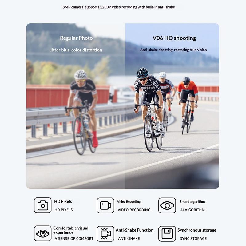 V06 AI Smartbriller til cykling og flyvning – 8 MP HD-kamera, 1200P videoopptak, Bluetooth 5.3, IP54, UV-beskyttelse, stemmeassistent