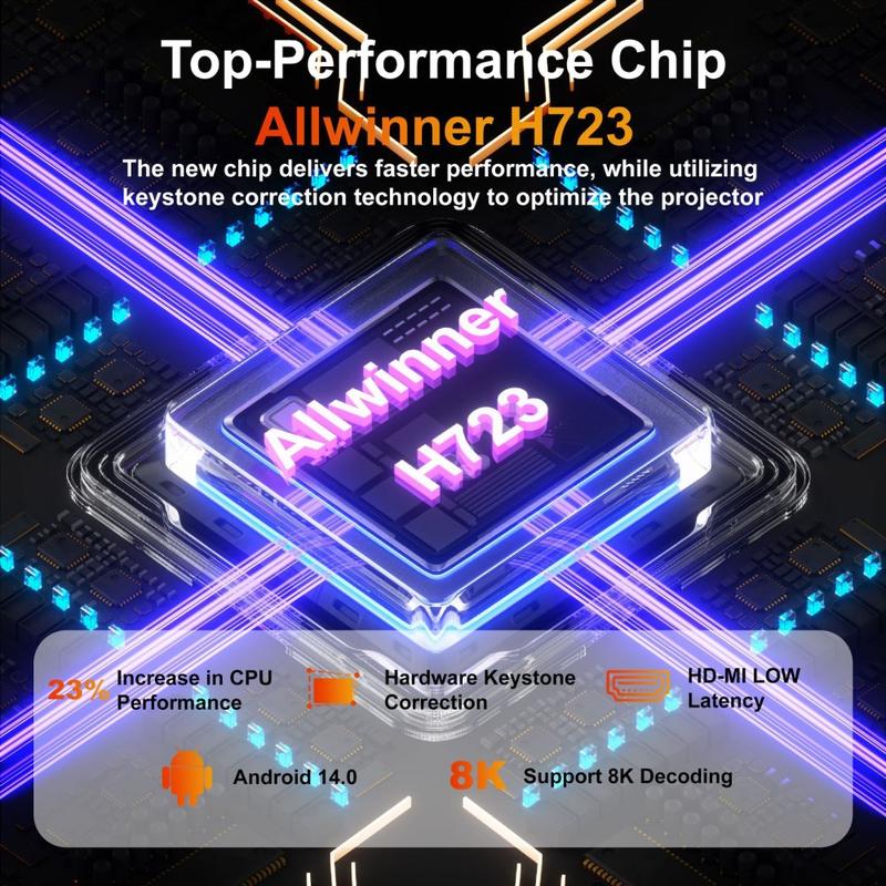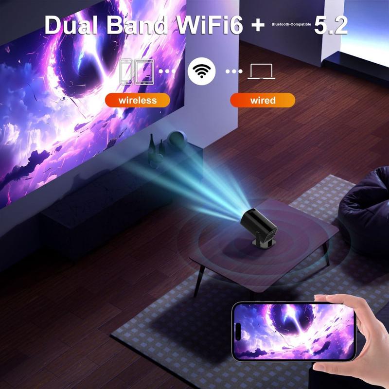Oppsettet er raskt og frustrasjonsfritt takket være automatisk keystone-korreksjon (30 %) og firepunktsjustering, som hjelper deg med å rette opp bildet selv når projektoren ikke er perfekt sentrert. Dual-band WiFi 6 og Bluetooth-kompatibel 5.2 støtter jevne trådløse tilkoblinger for skjermcasting, høyttalere og hodetelefoner, og den støysvake designen (<25 dB på 1 m) holder fokuset på det du ser på.
