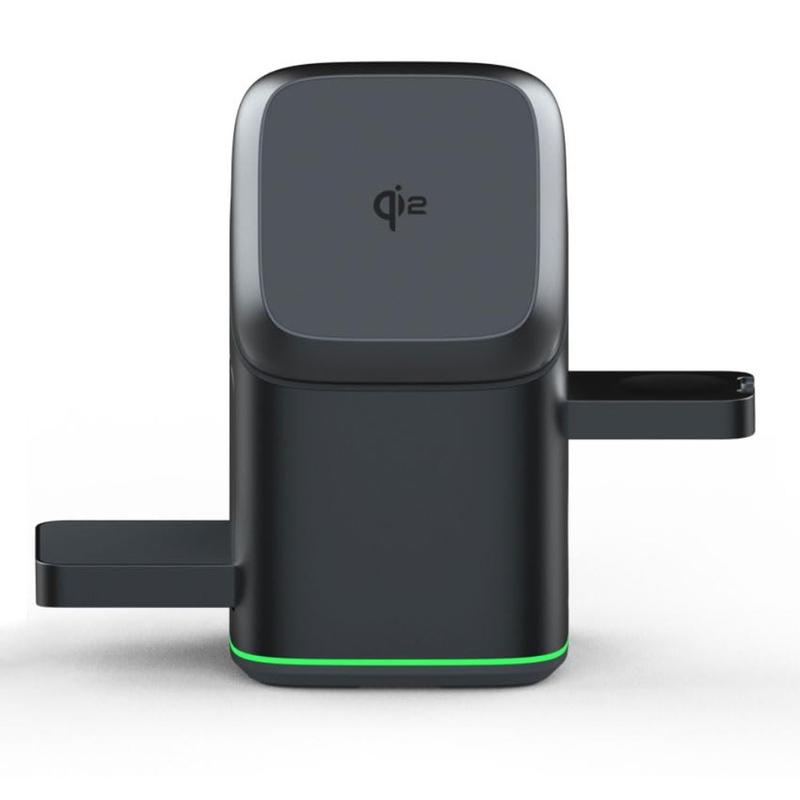 Den strømlinjeformede designen integrerer tre ladeposisjoner i én kompakt enhet. LED-indikatorene gir tydelig ladestatus, samtidig som den ser moderne og ryddig ut på skrivebordet eller nattbordet.