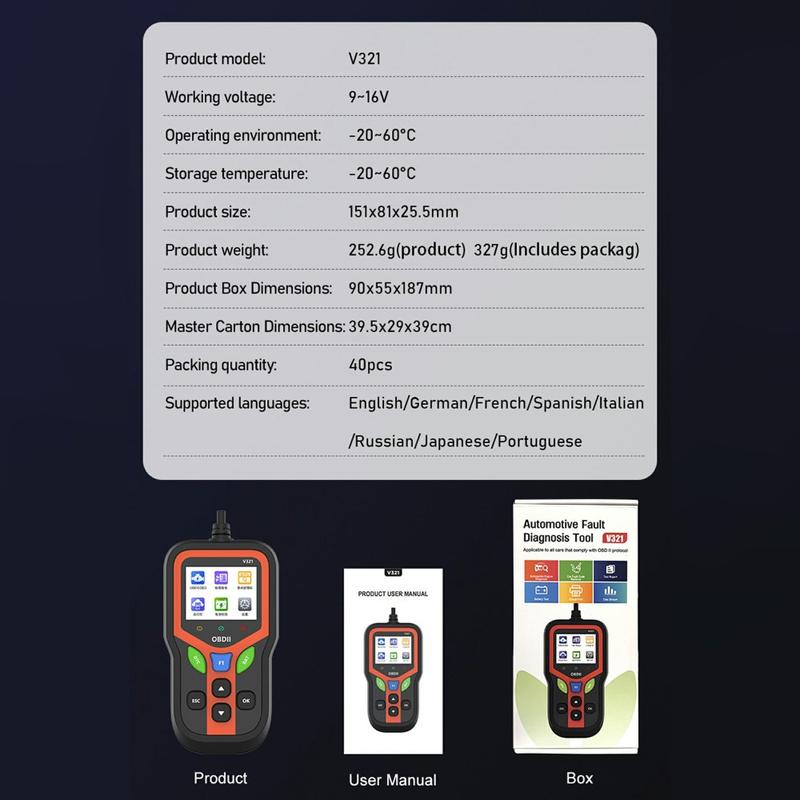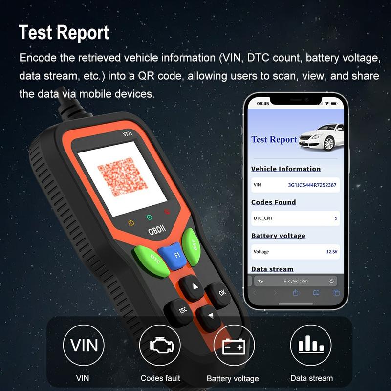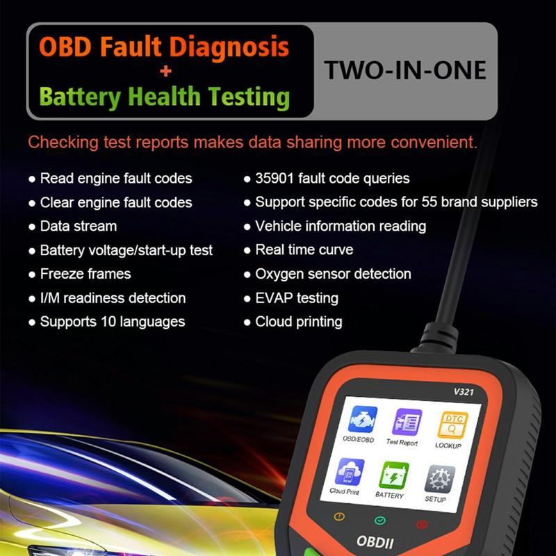 V321 OBD2 bildiagnostisk skanner - 2.4″ fargeskjerm, motorkodeleser med batterihelsetest, live data og flerspråklig meny