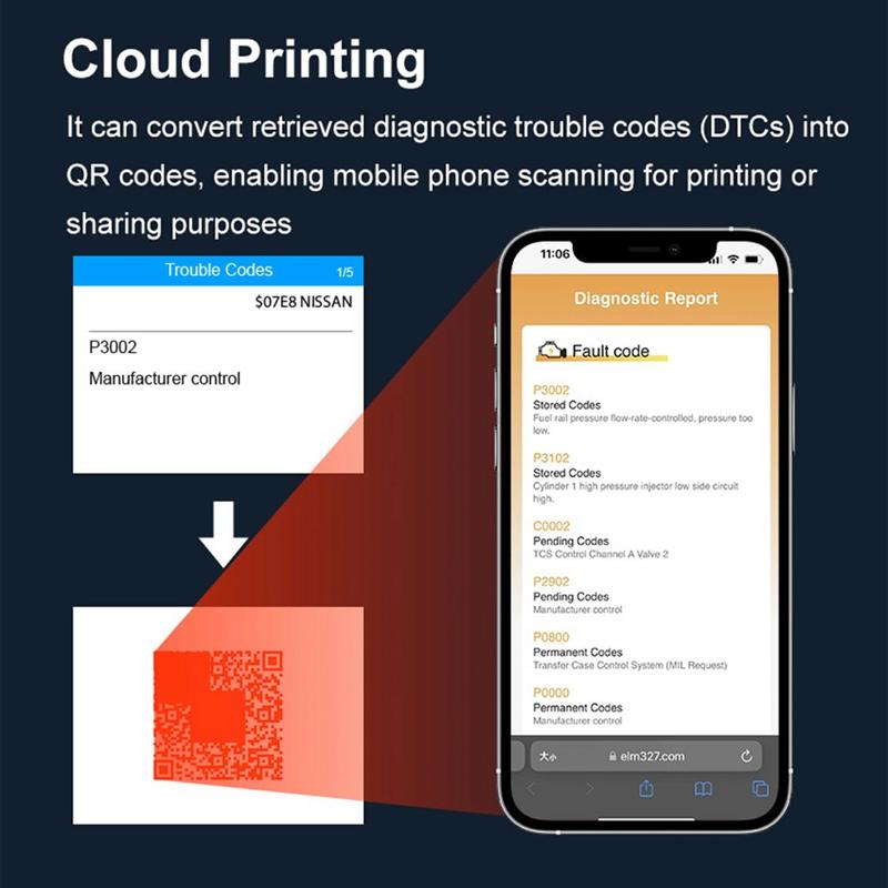 - Rask feilkodeavlesning/-tømming, visning av diagnoserapport og 12 V batteritest i én enhet