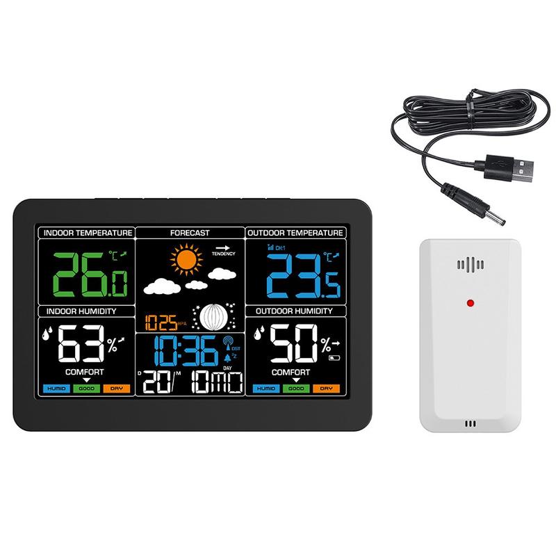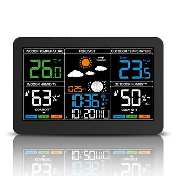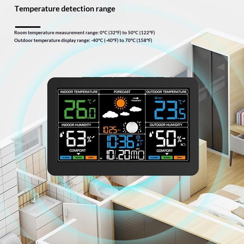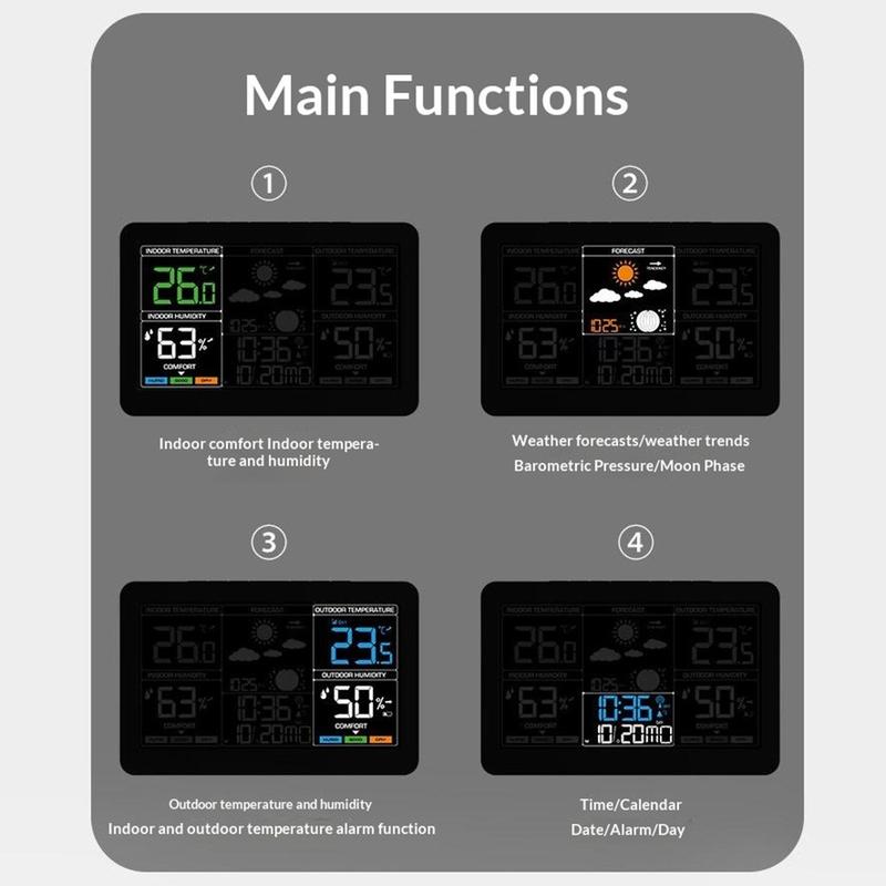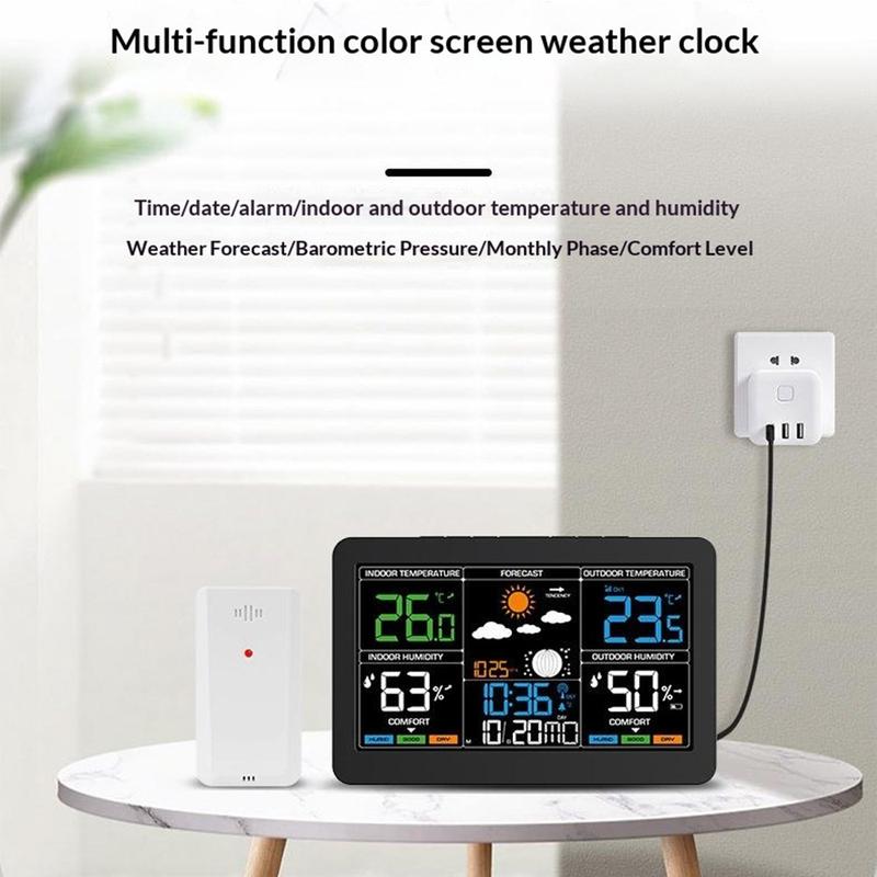 Denne trådløse værstasjonen kombinerer klokkeslett, dato, vekker, innendørs- og utendørstemperatur, fuktighetsmåling, værmelding, lufttrykk, månefase og visning av komfortnivå i én praktisk enhet. Med sin store fargeskjerm og oversiktlige utforming er den et nyttig tilskudd til soverommet, kjøkkenet, kontoret eller stuen. Den hjelper deg med å få oversikt over viktig daglig informasjon på et øyeblikk, samtidig som den bidrar til å holde rommet ditt mer ryddig.