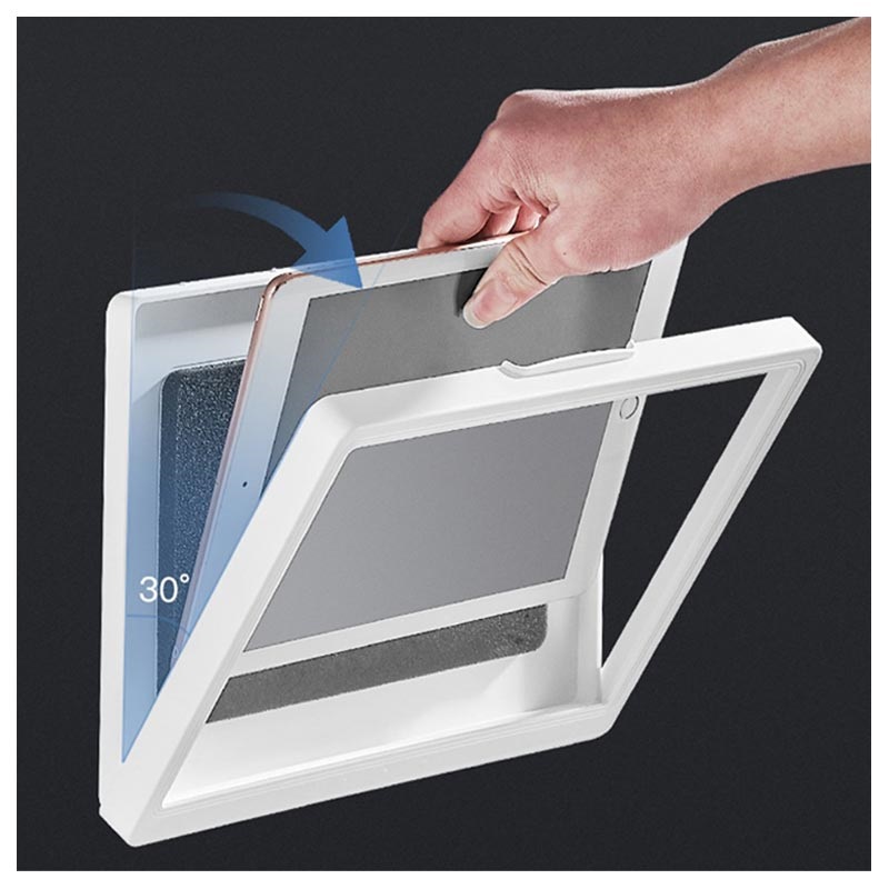 Nå kan nettbrettet følge deg helt inn i dusjen om du vil, takket være dette vanntette dekselet og veggmonteringsholderen. Dette vanntette dekselet har et anti-dugg, berøringsbart frontpanel med en 30-graders fast åpning, slik at du kan sette inn / ta ut nettbrettet uten å bekymre deg for å miste det. Med et enkelt veggfeste kan du plassere dette vanntette dekselet på en hvilken som helst vegg uten å bore et hull, sette nettbrettet i liggende eller stående stilling og nyte å se på film- eller videoklipp mens du lager mat eller dusjer.