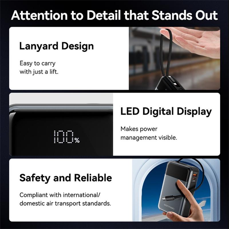 Vention FHYB0 20000mAh Power Bank med integrert USB-C-kabel - få strøm hvor som helst
