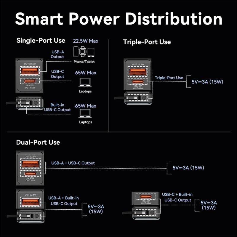- Maks utganger: USB-C 65W; USB-A 22,5 W; innebygd kabel 65W.