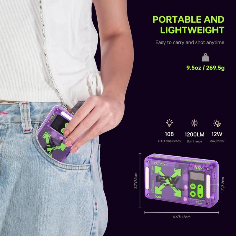Tilfør farger i studiokvalitet til alle opptak. Viltrox RB-V12 har 12 W med 360° fargeeffekt, magnetisk montering og smart appkontroll i et panel i håndflatestørrelse som bare veier 0,27 kg.