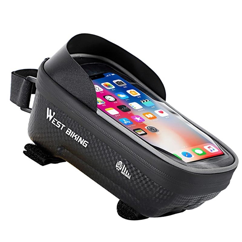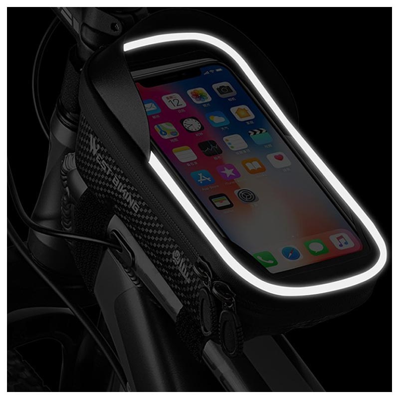 Med plass til en smarttelefon som er dekket med høysensitiv og gjennomsiktig TPU-frontside, slik at den kan brukes som telefonholder. West Biking sykkelveske er laget av regntett stoffmateriale og har en dobbel vanntett glidelås, slik at du ikke trenger å bekymre deg for det verdisakene hvis du kommer inn i regnet. I tillegg har West Biking sykkelveske et front solskjerm som effektivt blokkerer en del av lyset for å nå på smarttelefonen din. Den er også designet med reflekterende striper på sidene for tryggere nattkjøring.