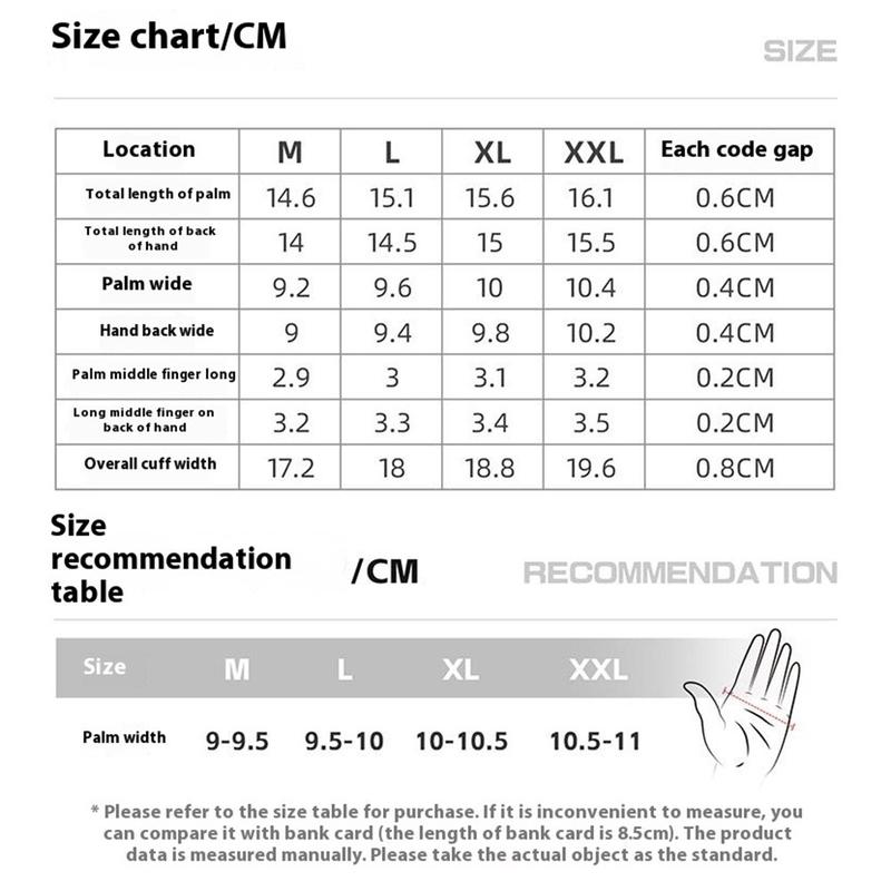 - Størrelse M: Håndflatebredde: 9,2 cm; Total lengde på håndflaten: 14,6 cm