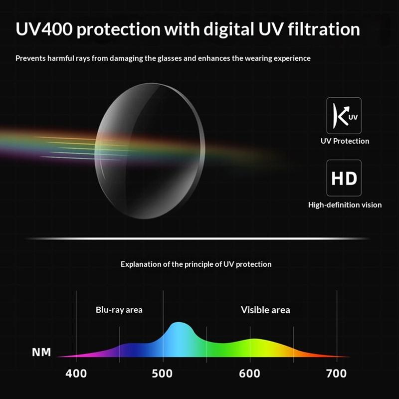 - UV400-belagte PC-linser hjelper med å blokkere UVA/UVB og reduserer ubehagelig gjenskinn i sterke lysforhold