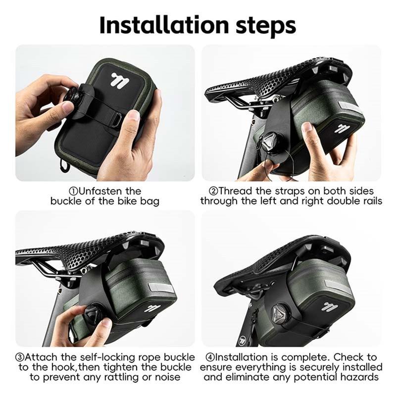 - Selvlåsende mekanisme: Innovativ selvlåsende design sørger for at vesken sitter godt festet til sykkelen, slik at den ikke løsner ved et uhell, selv i ulendt terreng.