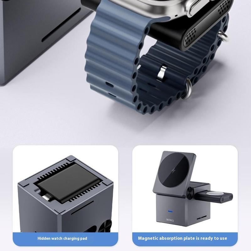 WIWU Wi-W030 er et allsidig 3-i-1 trådløst ladestativ som er designet for å gi strøm til iPhone, Apple Watch og AirPods samtidig. Med sin sammenleggbare design og sterke magnetiske tiltrekningskraft er den både praktisk og effektiv, noe som gjør den til et uunnværlig tilbehør for deg som har flere Apple-enheter.