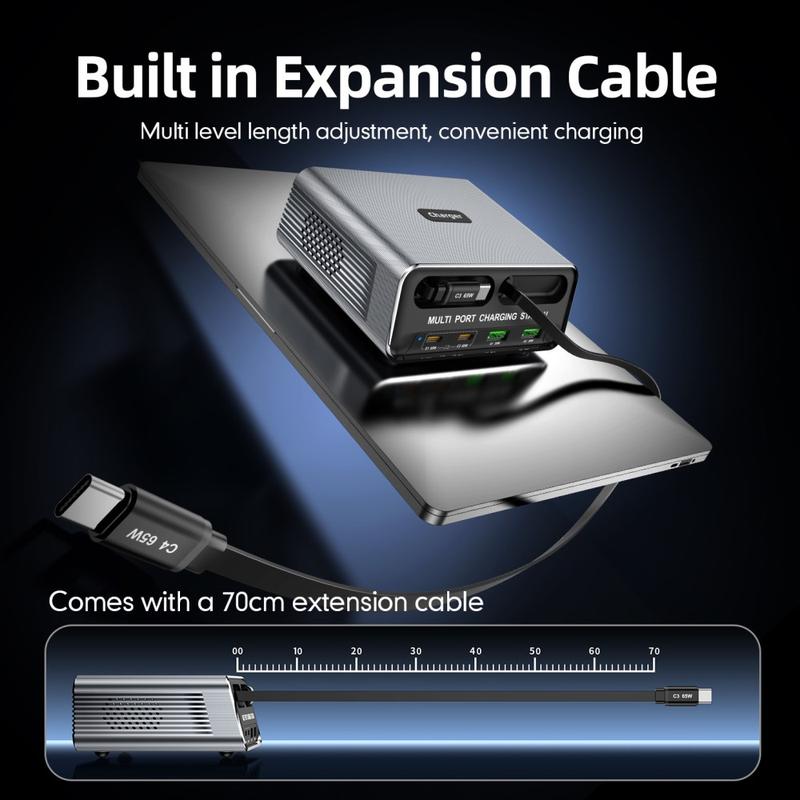 - 6-ports integrert design: 2xUSB-C + 2xUSB-A + 2x uttrekkbare USB-C-kabler