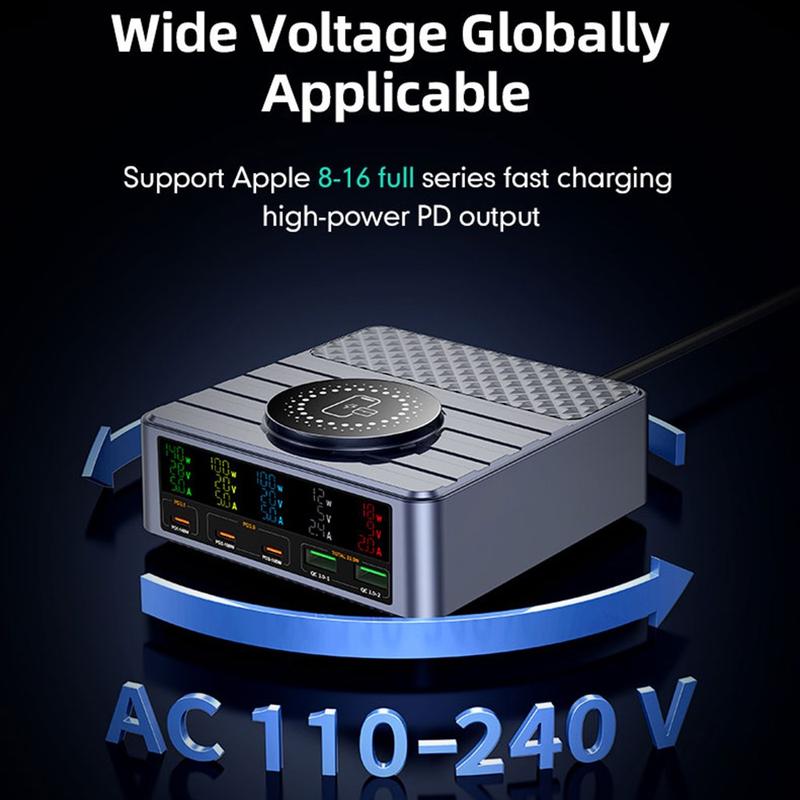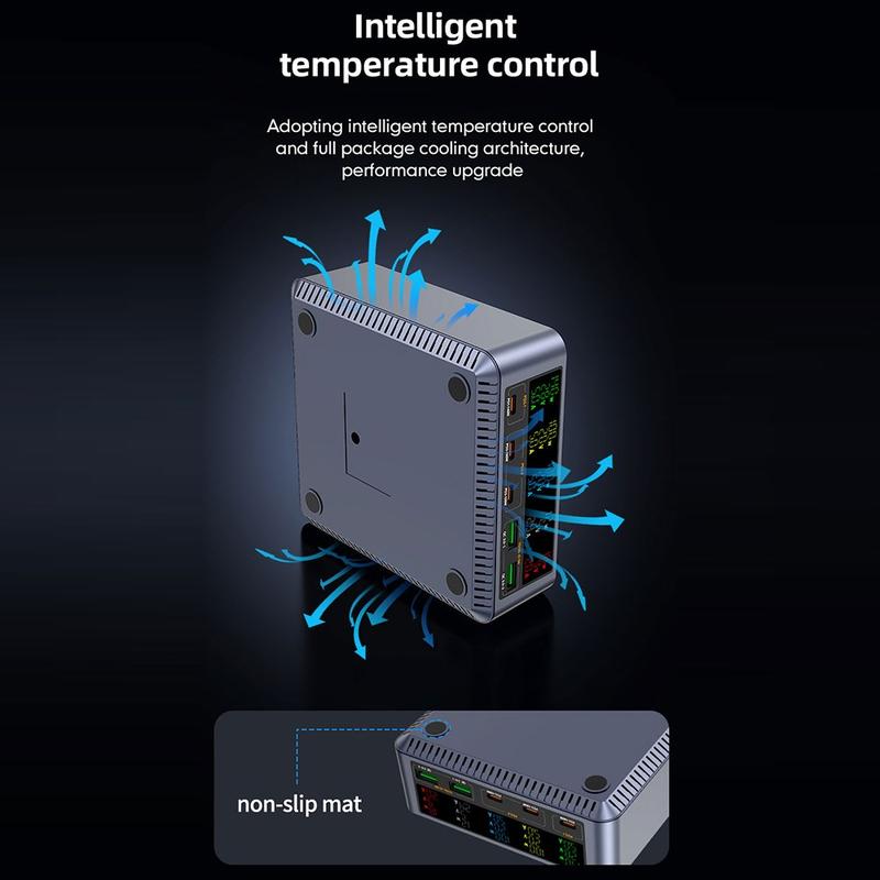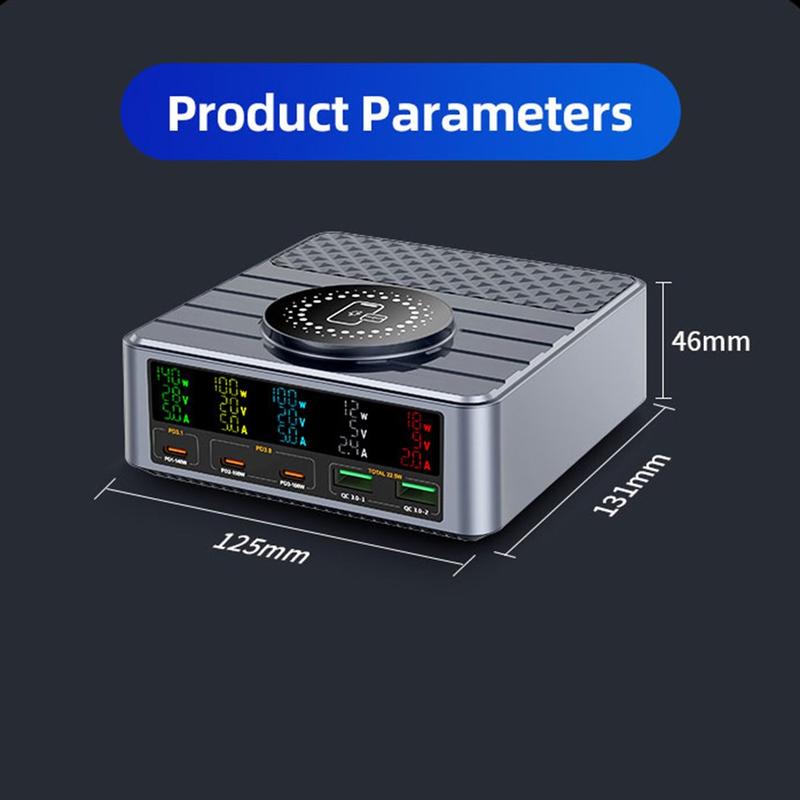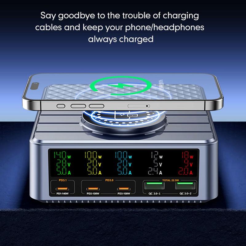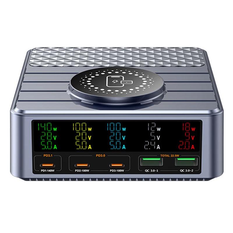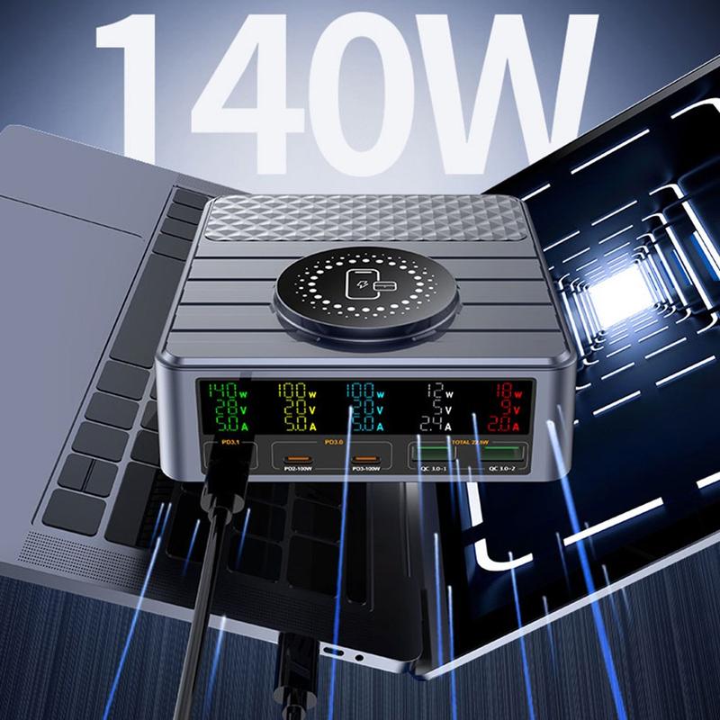 WLX-F2 er utstyrt med seks ladeutganger - inkludert to PD-hurtigladingsporter, tre QC-hurtigladingsporter og en trådløs ladeplate - og støtter samtidig lading av flere enheter uten at det går på bekostning av hastigheten. Den 140 W sterke PD3.1-utgangen med én port gir ultrahurtig lading for strømkrevende bærbare datamaskiner, og kan nå 80 % på bare 30 minutter for enheter som støttes.