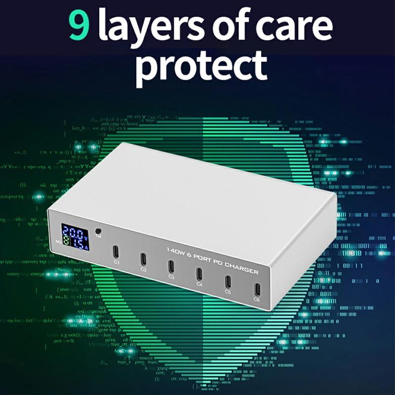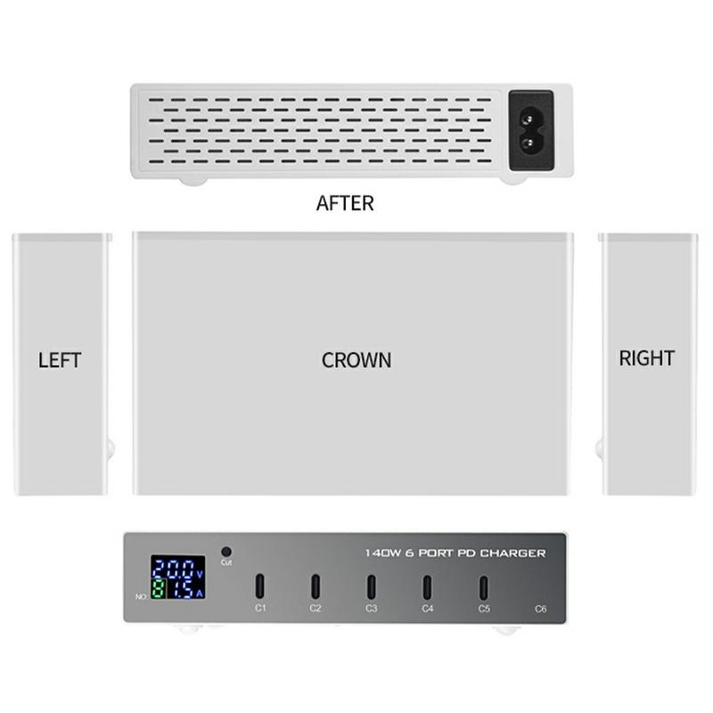 WLX-X6P 140W stasjonær ladestasjon - 6-porters GaN USB-C hurtiglader for bærbare datamaskiner, smarttelefoner og nettbrett (EU-plugg)