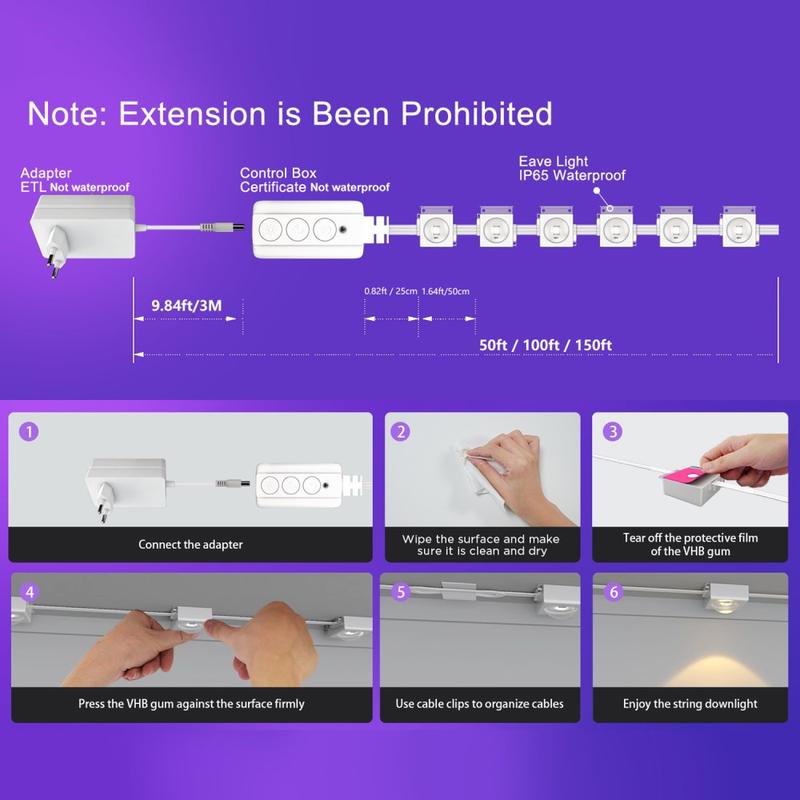 WY021 Vanntett, smart utendørs takfotlys / stemningslys med musikksynkronisering med appkontroll, stemmestyring