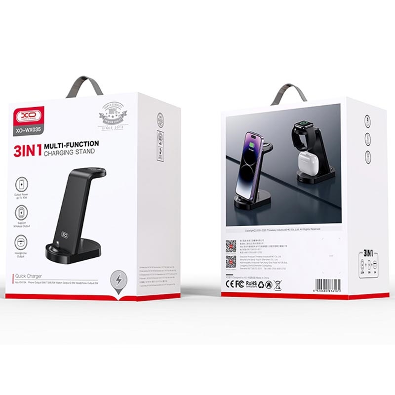 Vi presenterer XO Charging Stand WX035, en allsidig 3-i-1-ladeløsning som er designet for å effektivisere ladeopplevelsen for smarttelefoner, Bluetooth-hodetelefoner og Apple Watch. Dette elegante ladestativet er ideelt for bruk både hjemme og på kontoret, og gir en praktisk og organisert måte å lade viktige enheter på. Ladestativet XO WX035 er utstyrt med Lightning-kontakter som gir en 15 W ladeløsning for smarttelefoner og Bluetooth-hodetelefoner. I tillegg har den en induktiv lader som er kompatibel med Apple Watch, noe som gjør den til en omfattende ladestasjon. Med effektalternativer på 5 W, 7,5 W og 10 W dekker dette ladestativet de ulike ladebehovene til forskjellige enheter, noe som sikrer effektive og optimaliserte ladehastigheter.