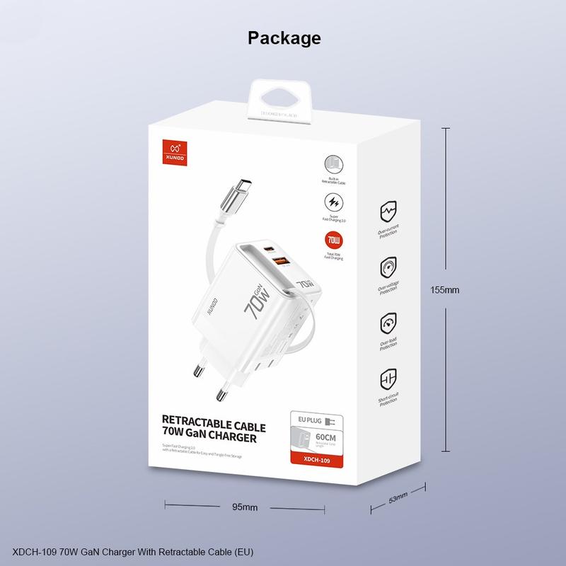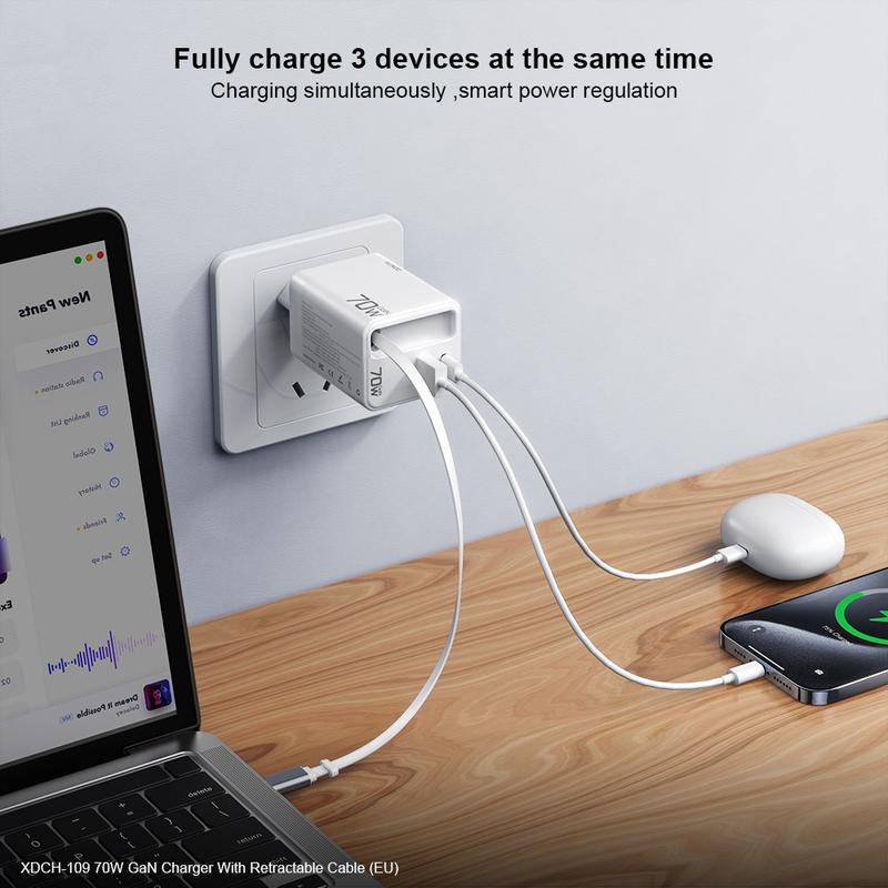 Xundd XDCH-109 70W GaN hurtiglader - EU-kontakt, uttrekkbar 60 cm USB-C-kabel og strømadapter med 3 porter for bærbare datamaskiner, nettbrett og smarttelefoner