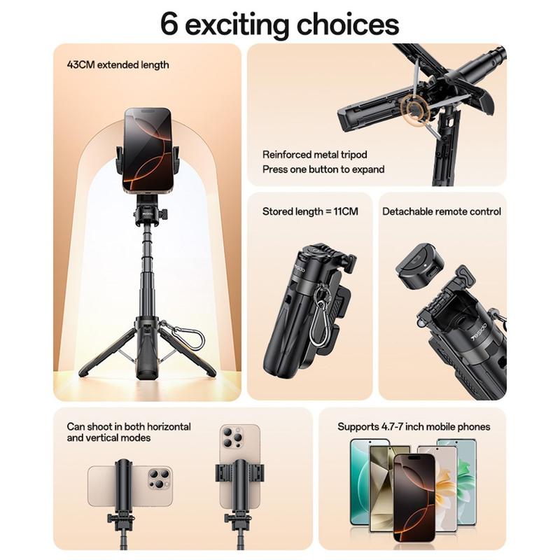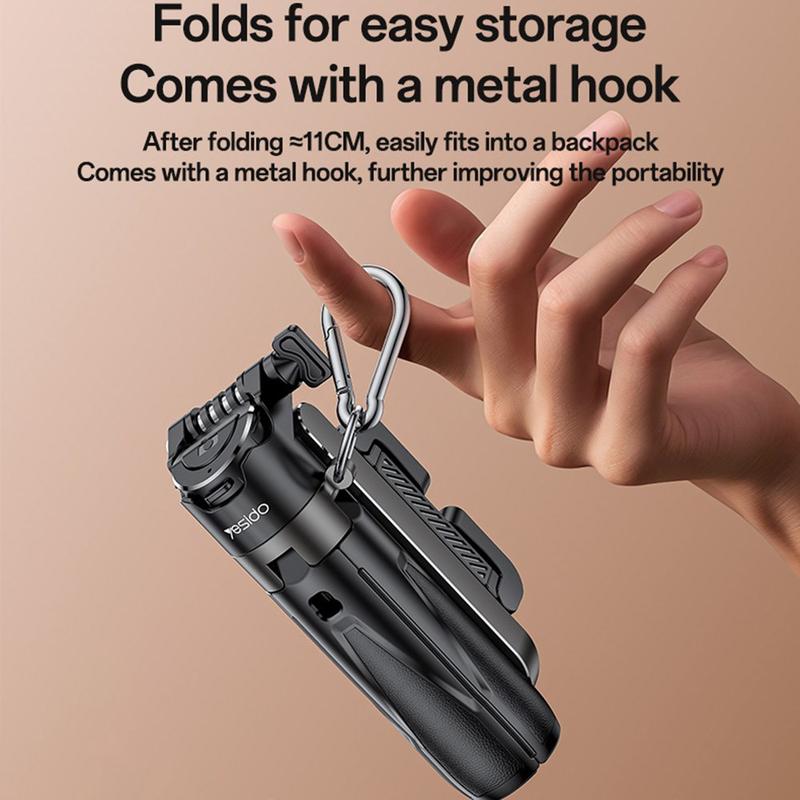 Fang hver eneste reise uten klumpete utstyr. YESIDO SF29 kan brettes ned til bare 10 cm for lommevennlig reise, og kan deretter utvides til 43 cm og åpnes til et stabilt stativ med fire ben. En avtakbar Bluetooth-fjernkontroll og 360 graders roterende klemme gjør det enkelt å veksle mellom portrettvlogger, gruppebilder i landskap og håndfrie direktesendinger. Enten du vandrer på fjellstier eller presenterer produkter på et skrivebord, holder denne lette hjelperen telefonen stødig og kreativiteten din i gang.