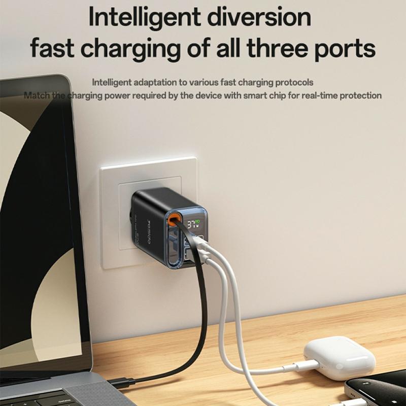 Lad smartere og raskere med YESIDO YC100 67W GaN hurtiglader, en kompakt og effektiv løsning designet for moderne enheter. Med to porter, avansert Gallium Nitride (GaN)-teknologi og en innebygd uttrekkbar kabel kombinerer den kraft, bekvemmelighet og sikkerhet - perfekt for bruk hjemme, på kontoret eller på reise.