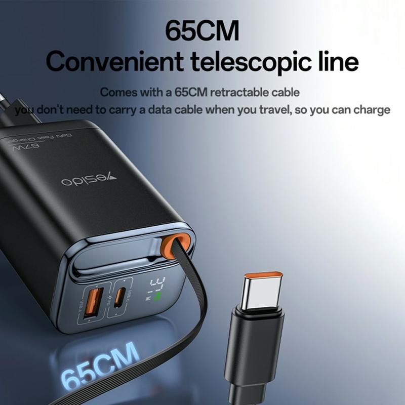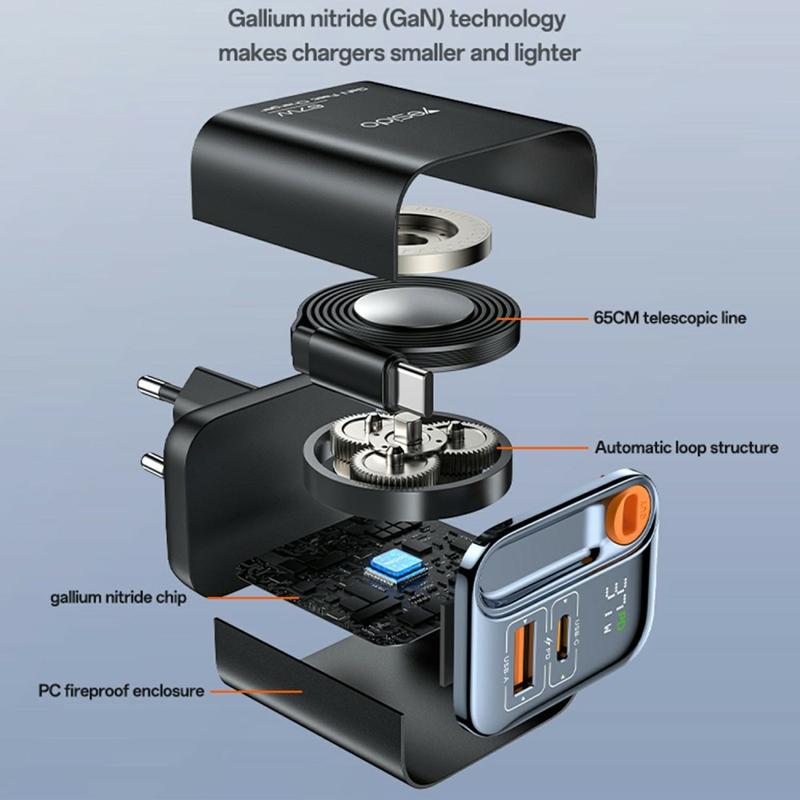 Yesido YC100 67W hurtiglader med uttrekkbar Type-C-kabel - USB-A og USB-C GaN ladeadapter - EU-kontakt