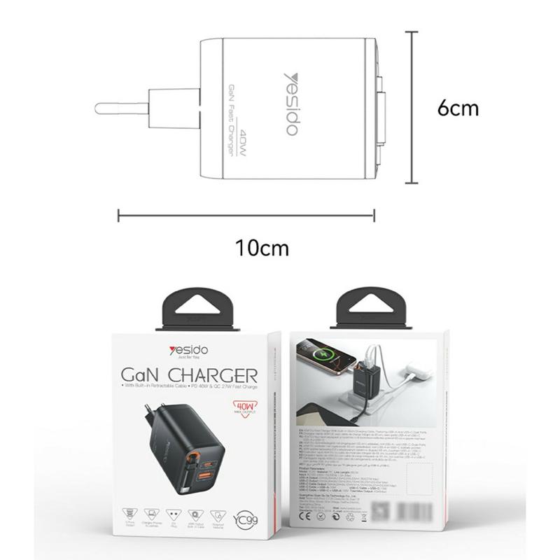 Yesido YC99 40 W hurtiglader med uttrekkbar Type-C-kabel - USB-A- og USB-C GaN-ladeadapter - EU-kontakt