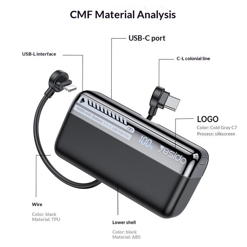 YP99 er laget av PC, UV-belagte og galvaniserte materialer med et ABS-skall og TPU-kabel, og er designet for å kombinere bærbarhet med holdbarhet. Den glatte, sylindriske formen gir den et moderne utseende, samtidig som den er enkel å holde og pakke ned. Kontaktene er designet for å tåle opptil 10 000 ladesykluser, noe som bidrar til lengre levetid i daglig bruk.