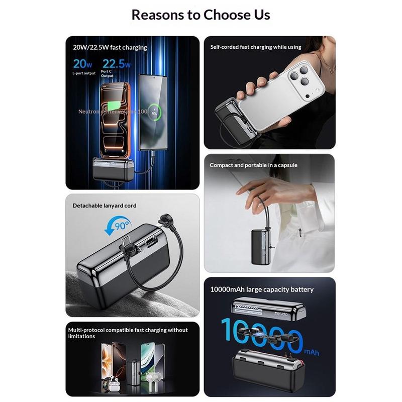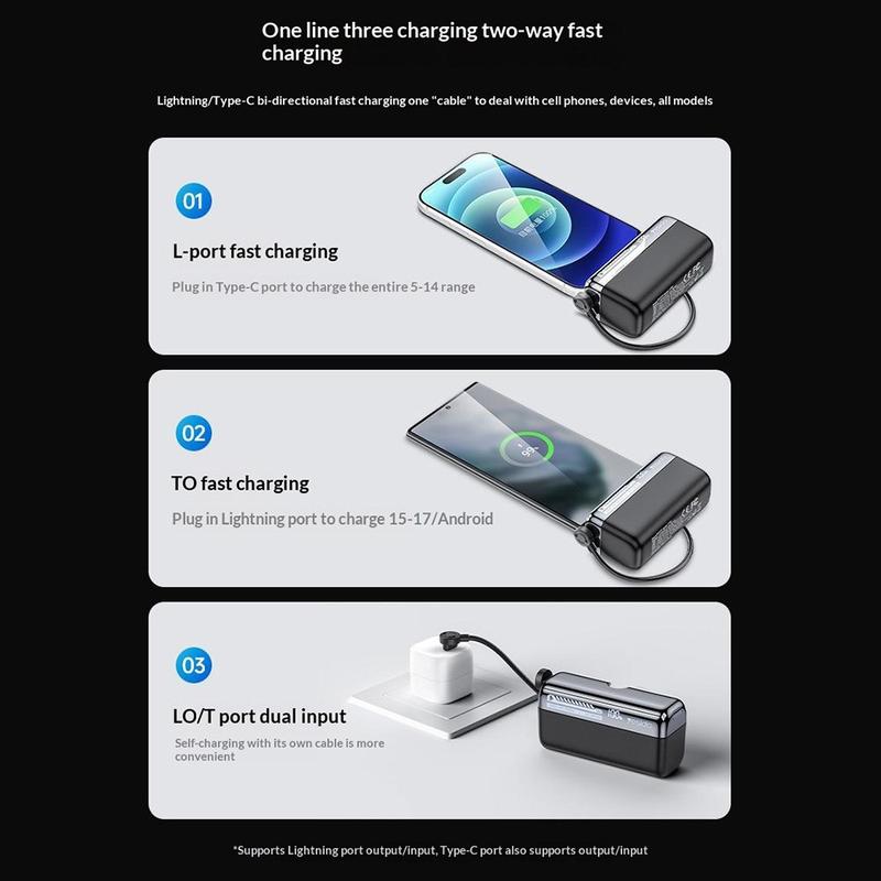 Denne powerbanken støtter flere hurtigladingsprotokoller, inkludert PD, QC, AFC, SCP og FCP, noe som gjør at den fungerer effektivt med et bredt spekter av enheter. Den leverer opptil 22,5 W utgangseffekt via USB-C og opptil 20 W via USB-L, noe som gjør den egnet for rask lading av kompatible telefoner, tilbehør og annen bærbar elektronikk. Hurtiglading kan være spesielt nyttig når du trenger en rask opplading i travle dager eller mens du er på farten.