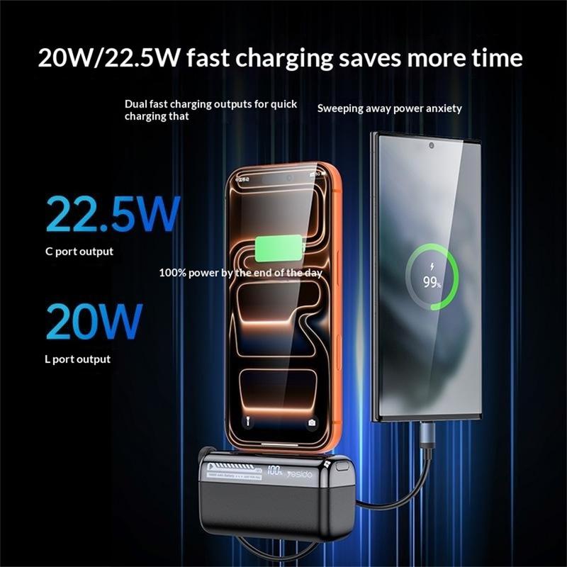 Yesido YP99 10000mAh powerbank med 22,5 W hurtiglading, innebygd USB-C-til-Lightning-kabel og digitalt display