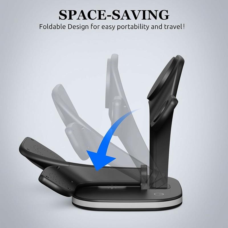 - 3-i-1 trådløs lading: Denne stasjonen er utstyrt med to innebygde ladeputer som er kompatible med MagSafe, og gjør det mulig å lade iPhone, Apple Watch og AirPods samtidig, slik at du kan effektivisere ladebehovene dine.