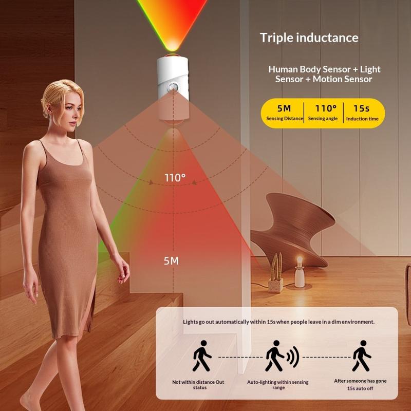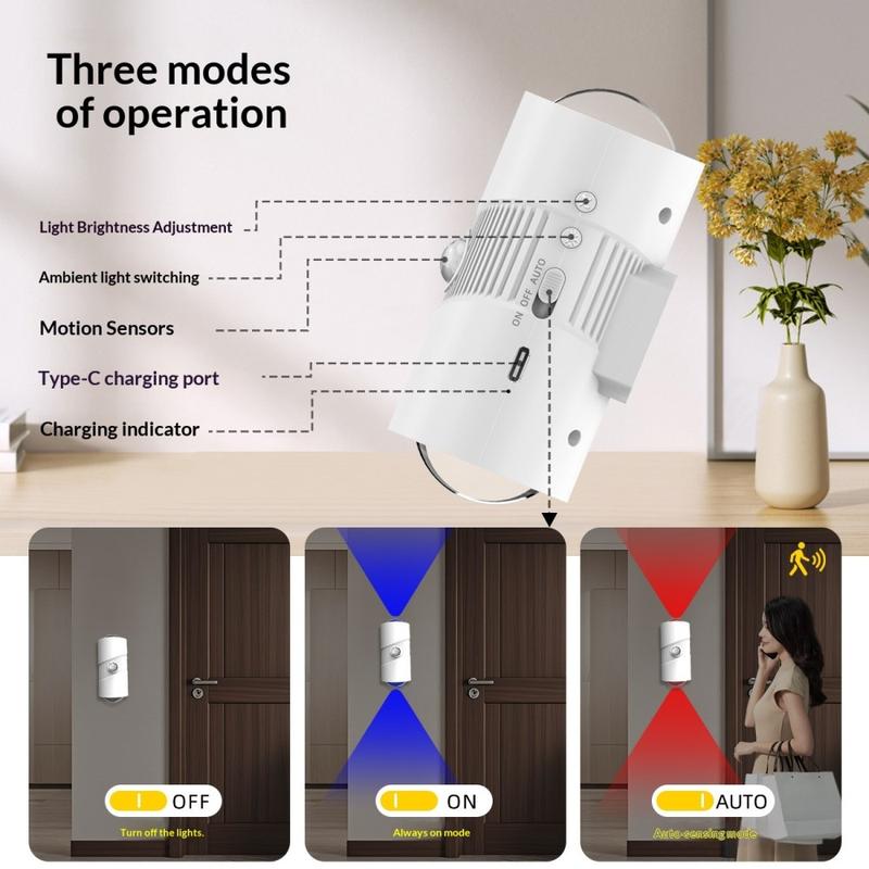 Det smarte sensorsystemet reagerer på bevegelse i svakt lys, slår seg automatisk på og slår seg av etter en kort forsinkelse for å spare energi. Med 4 lysstyrkenivåer og flere lysmoduser kan den brukes både som et praktisk nattlys og som et koselig stemningslys. Den magnetiske installasjonsdesignen gjør plasseringen enkel, uten boring eller komplisert oppsett.