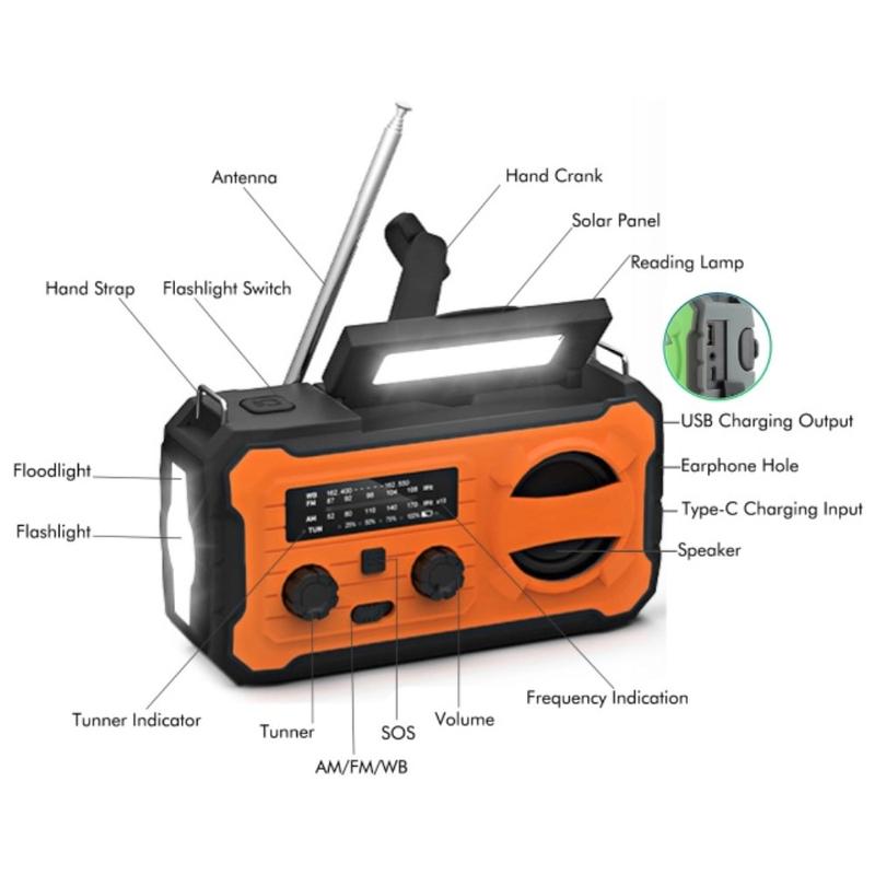 - Multifunksjonelt overlevelsesverktøy: radio, lommelykt, leselampe, solcellelader og strømbank