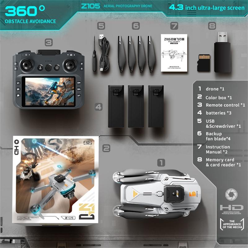 Z105 Smart drone med to kameraer, 4.3" skjerm, kontroller og 3 batterier - børsteløs quadcopter med motor for å unngå hindringer