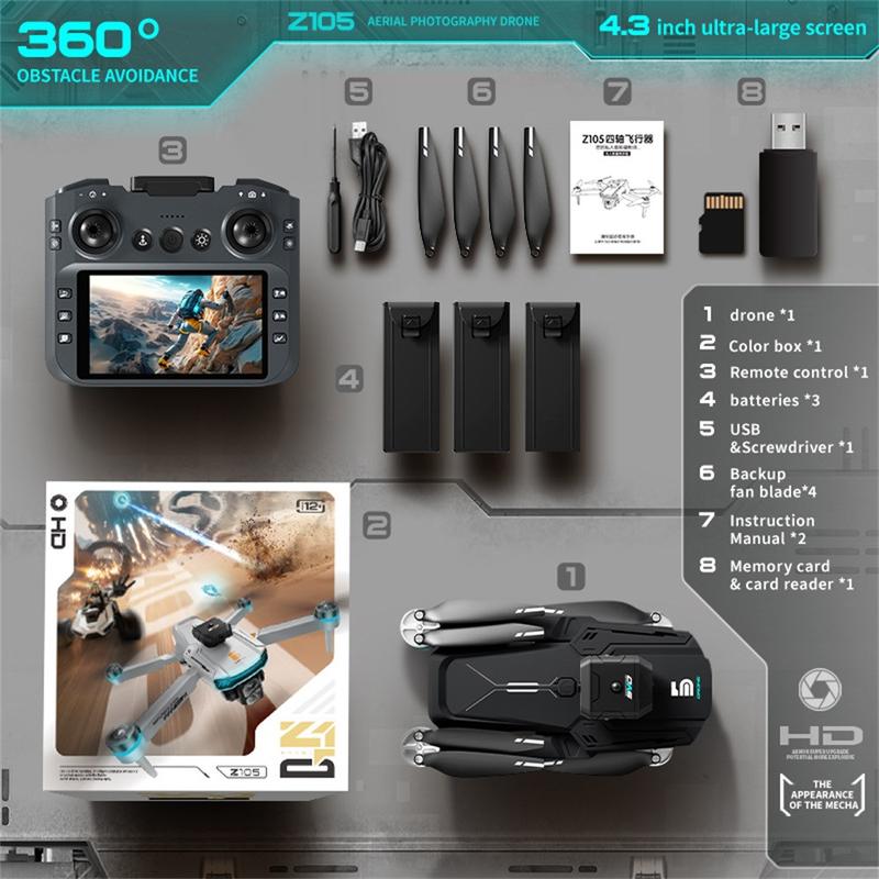Z105 Drone kombinerer bærbarhet, innovasjon og ytelse i én kompakt pakke. Med 4.3-tommers skjermkontroll, børsteløse motorer og avanserte flyfunksjoner er den det ultimate verktøyet for uanstrengt, stabil luftfotografering og oppslukende flyopplevelser.