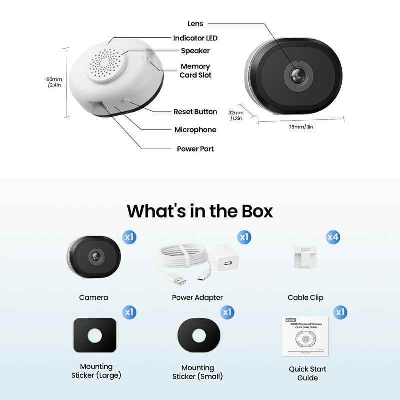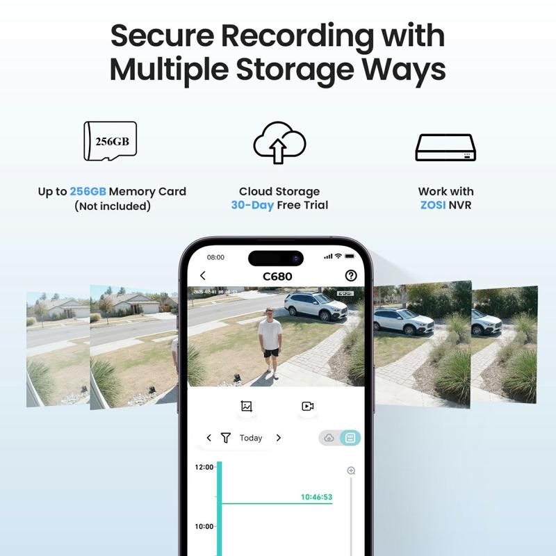 - Lagringsplass: Støtter microSD-kort på opptil 256 GB (ikke inkludert), skylagring og ZOSI NVR-integrering